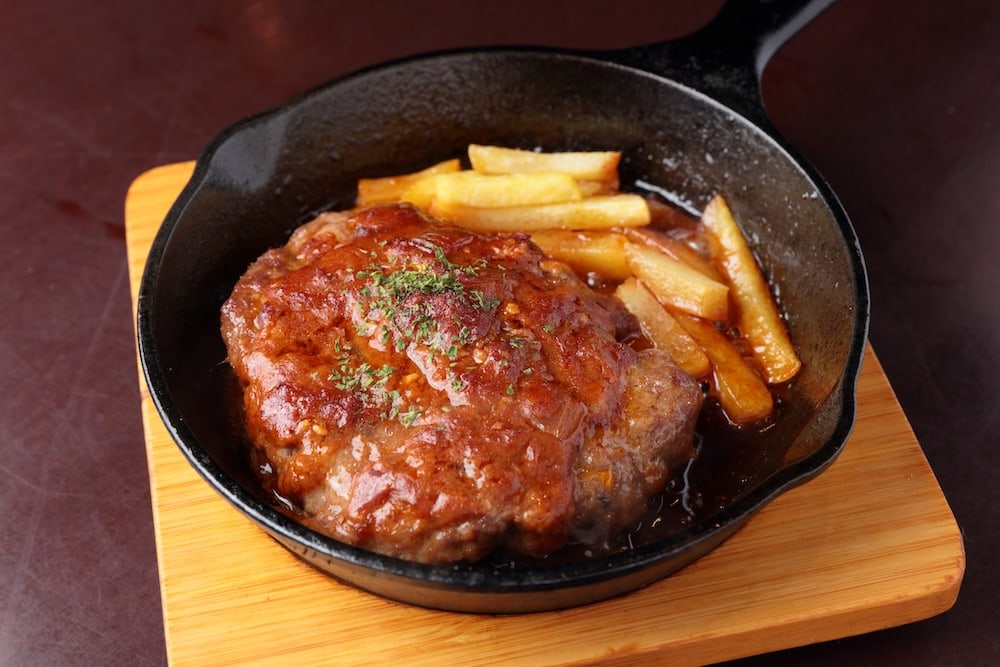 スキレットで味わえる、アツアツの自家製ハンバーグ(単品1,230円、夜定食1,530円)。牛100%の粗挽き肉を使い、ゴロゴロとした食感は食べ応え満点