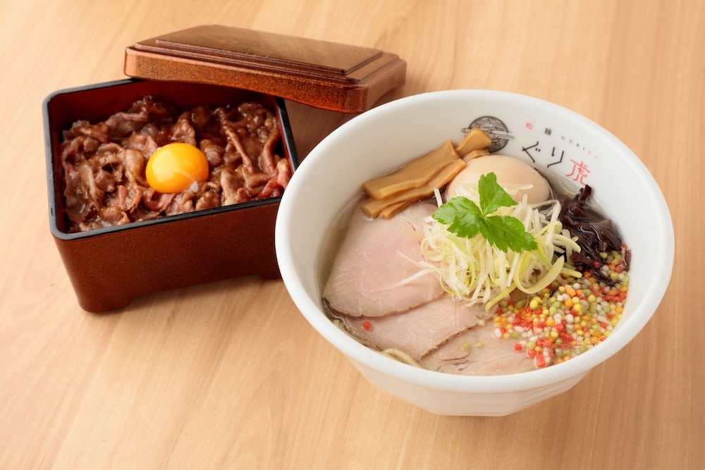 国産の天然真鯛を贅沢に使った特製鯛塩らーめん(1,150円)。+550円で、A4ランク以上を厳選した黒毛和牛すき焼き丼付きに