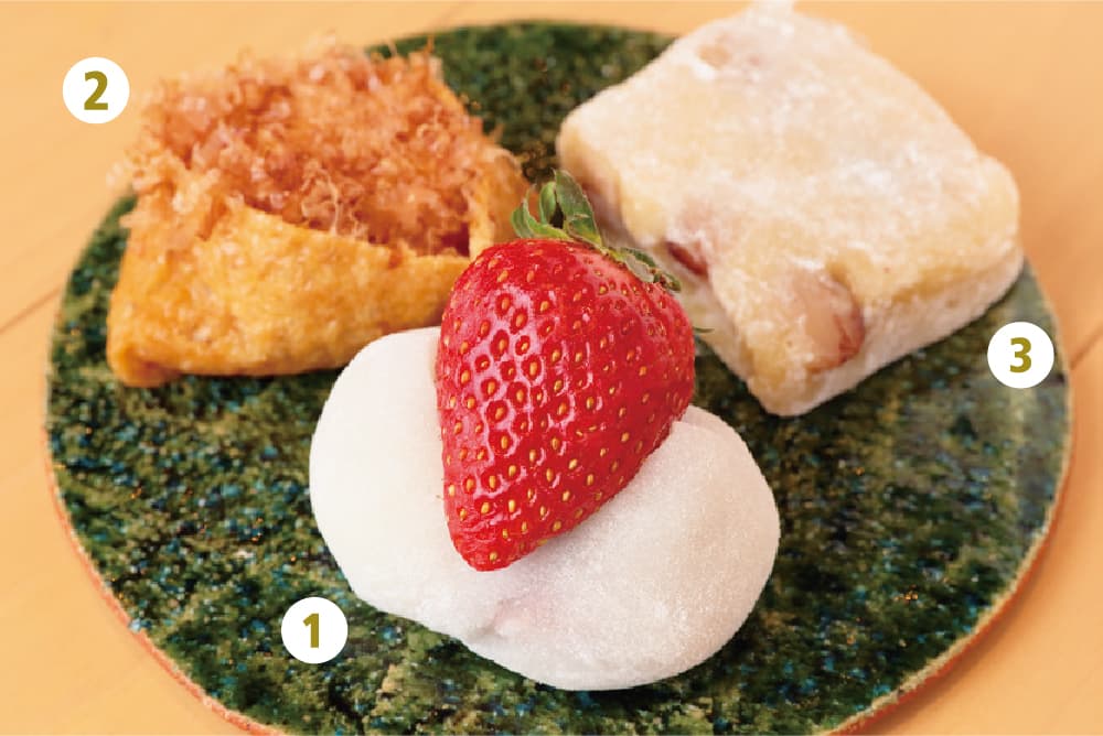 1.大粒の国産イチゴを使用した苺餅(529円)は通年商品