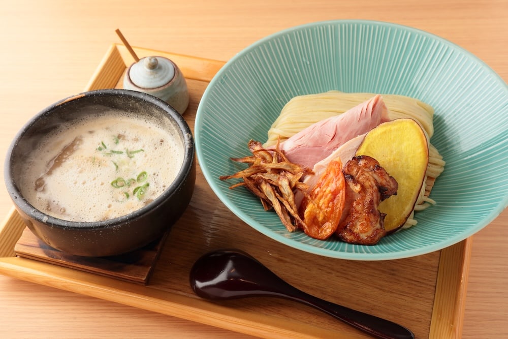 鮮魚の濃厚つけ麺(1,200円)。グツグツと沸騰したつけ汁はアツアツ。風味豊かな麺はすすり心地がよく、別添えの柚子胡椒で味変もできる