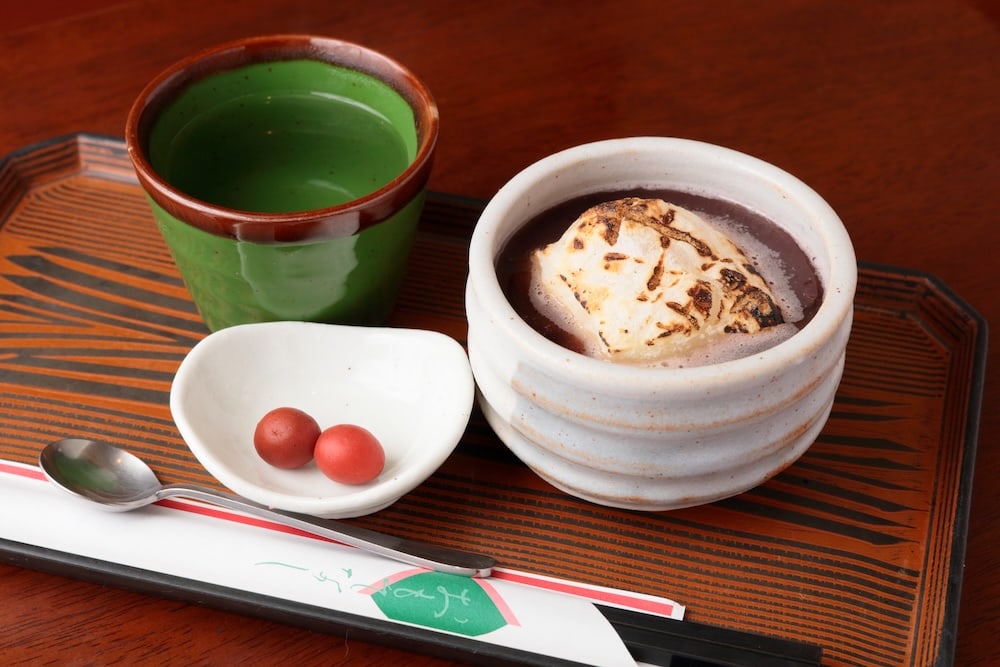 サラッとした汁とつぶあんに、香ばしく焼き上げた餅をトッピングした、昔ながらのぜんざい(680円)。口直しに、カリカリ梅が添えられている