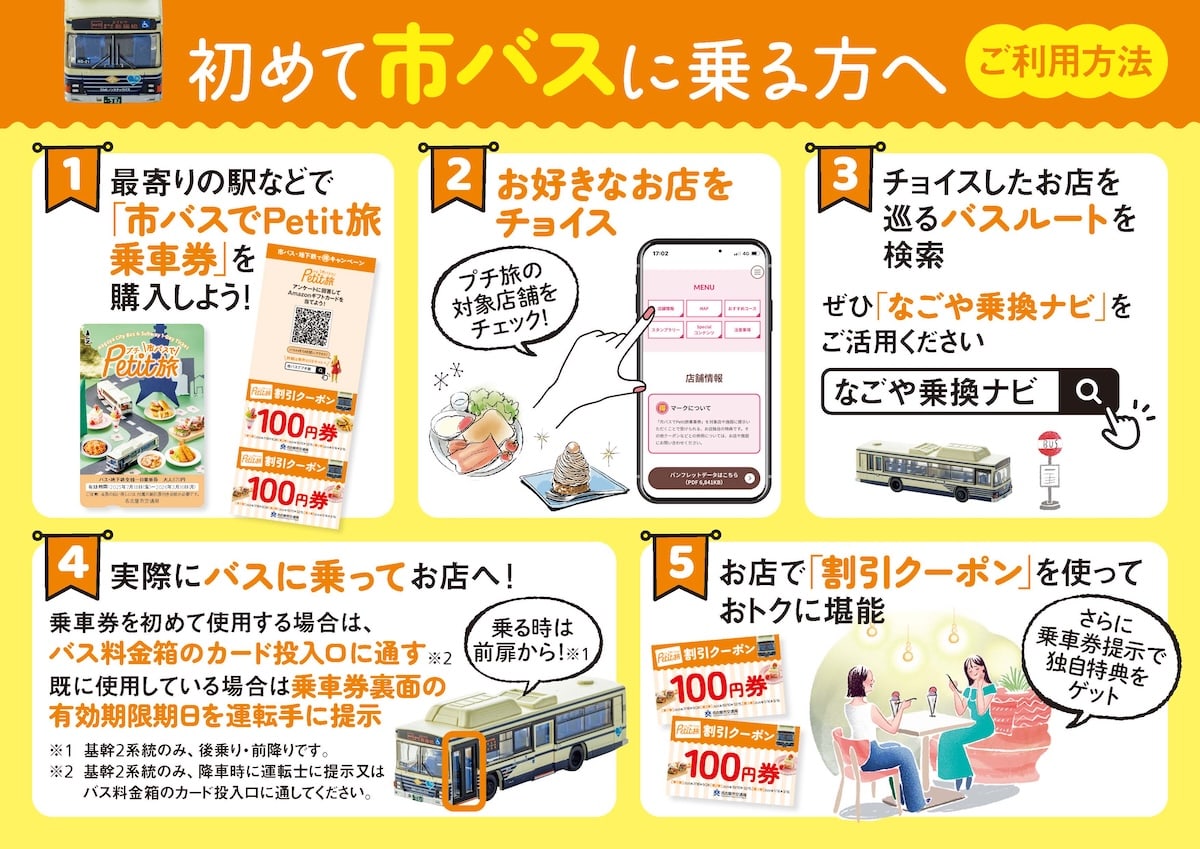 「市バスでPetit旅乗車券」を対象店や施設に提示いただくことで受けられる、お店独自の特典です。その他クーポンなどとの併用については、お店や施設にお問い合わせください。