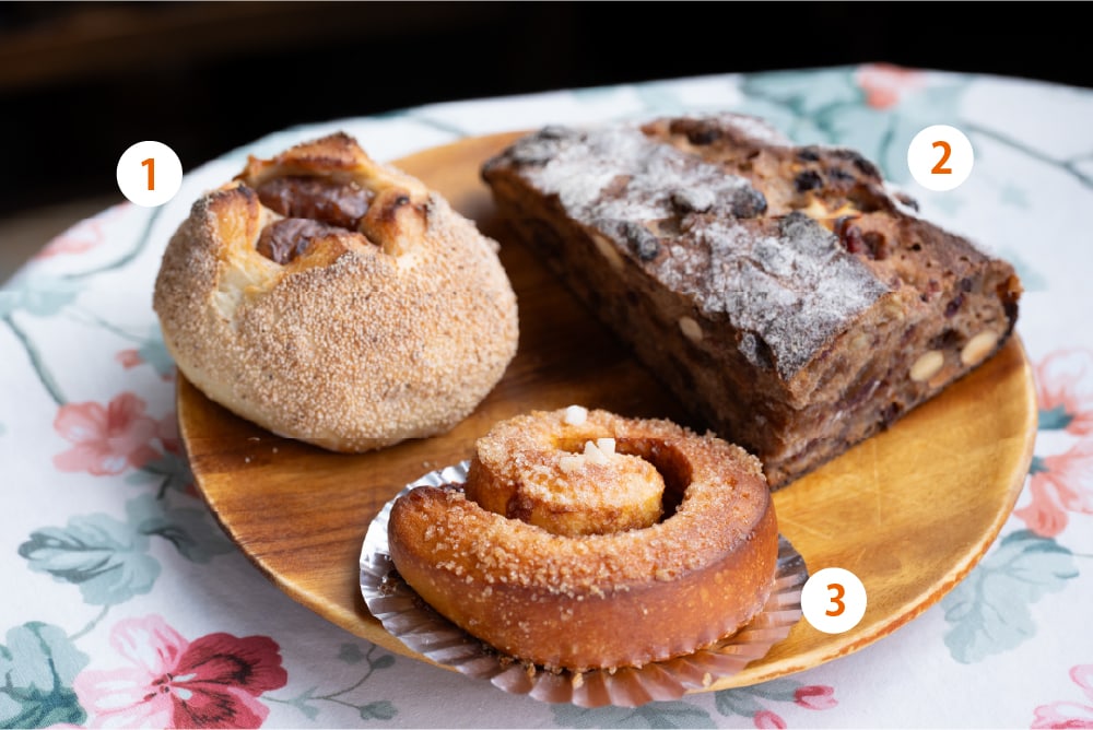 2.たっぷり!ドライフルーツとナッツのカンパーニュ(570円)は、生地よりも多い具材をゴロゴロと練りこんでいる